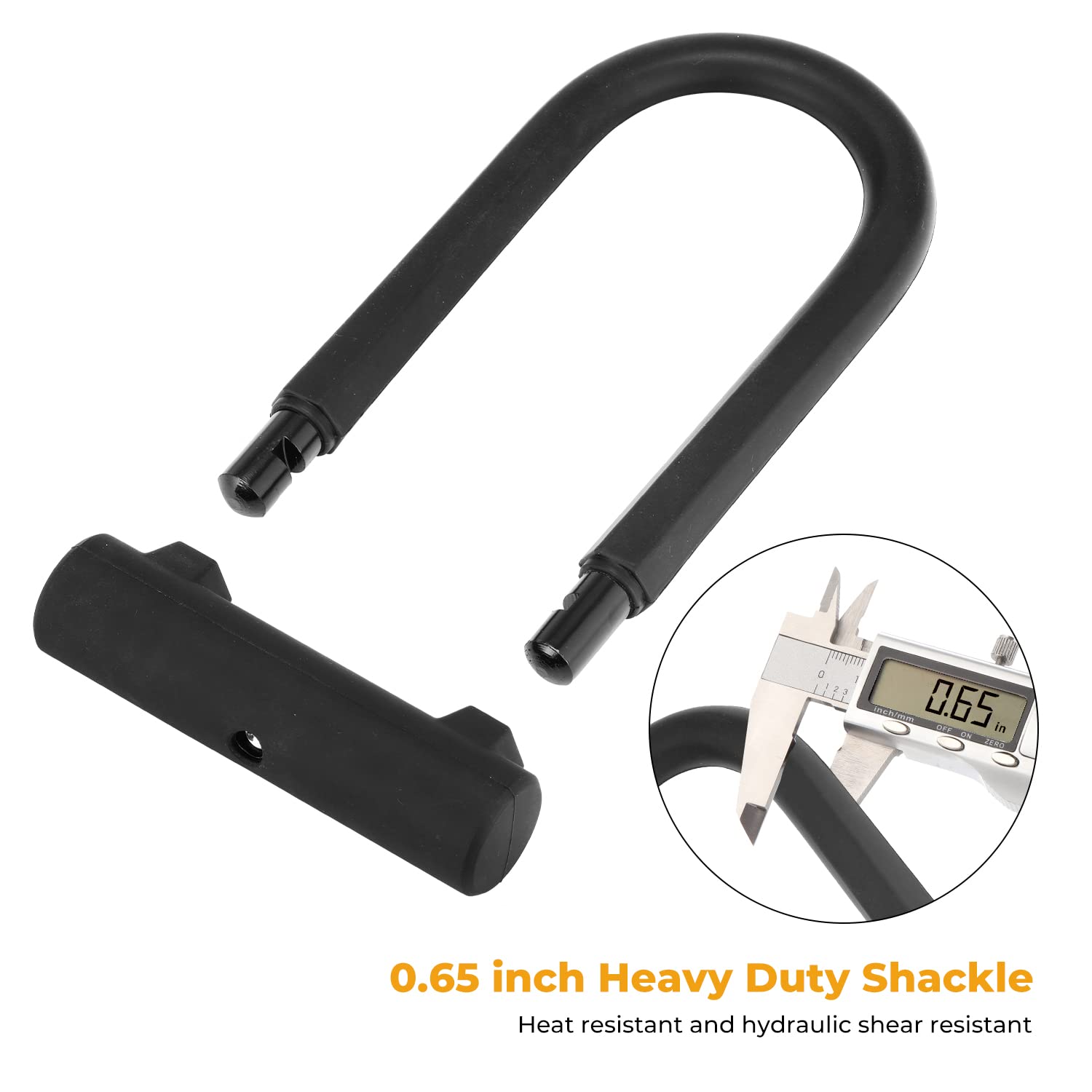 • Material: Hardened steel shackle; ABS + reinforced alloy lock body; polyurethane sleeve