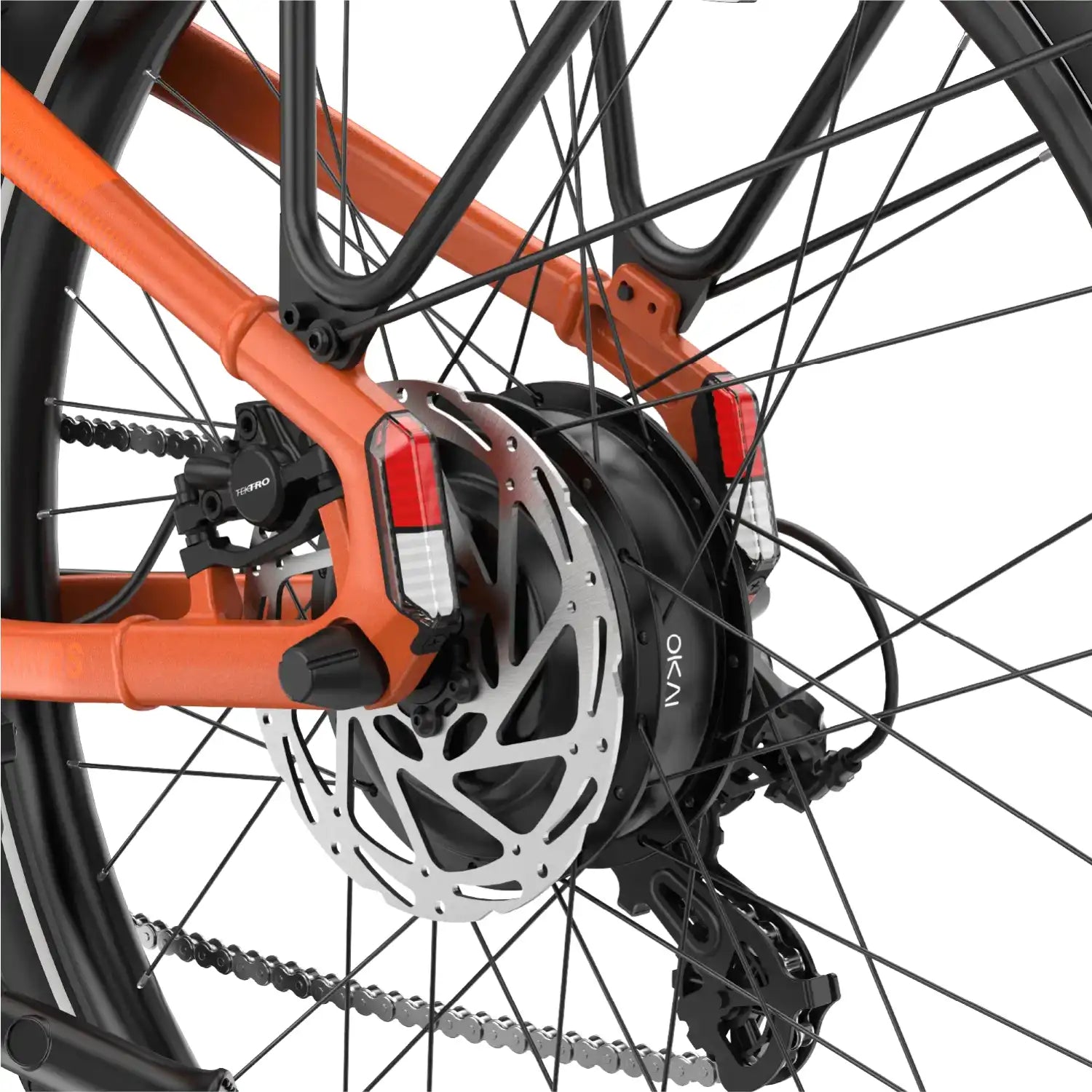 - Brushless rear-hub electric motor with pedal-assist and thumb throttle support.